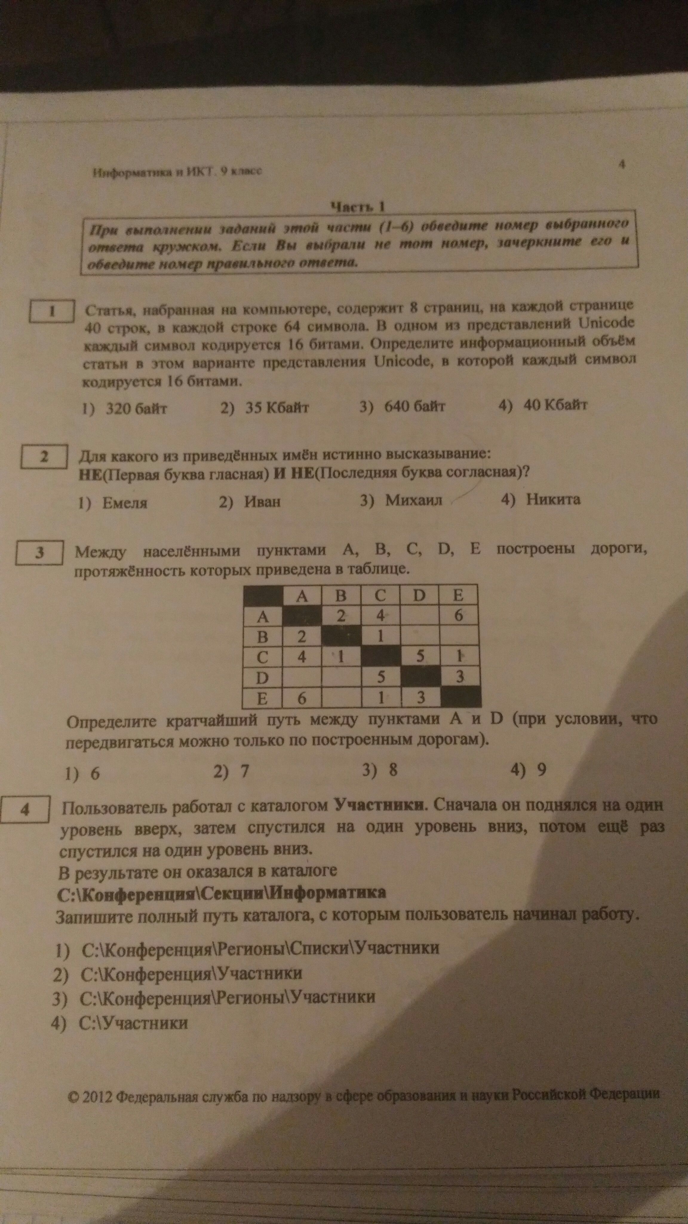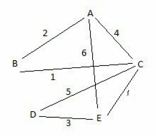 Нам нужно от А попасть до D, у нас есть такие пути: AED(6+3=9), ACD(4+5=9), ACED(4+1+3=8), ABCD(2+1+5=8), ABCED(2+1+1+3=7)