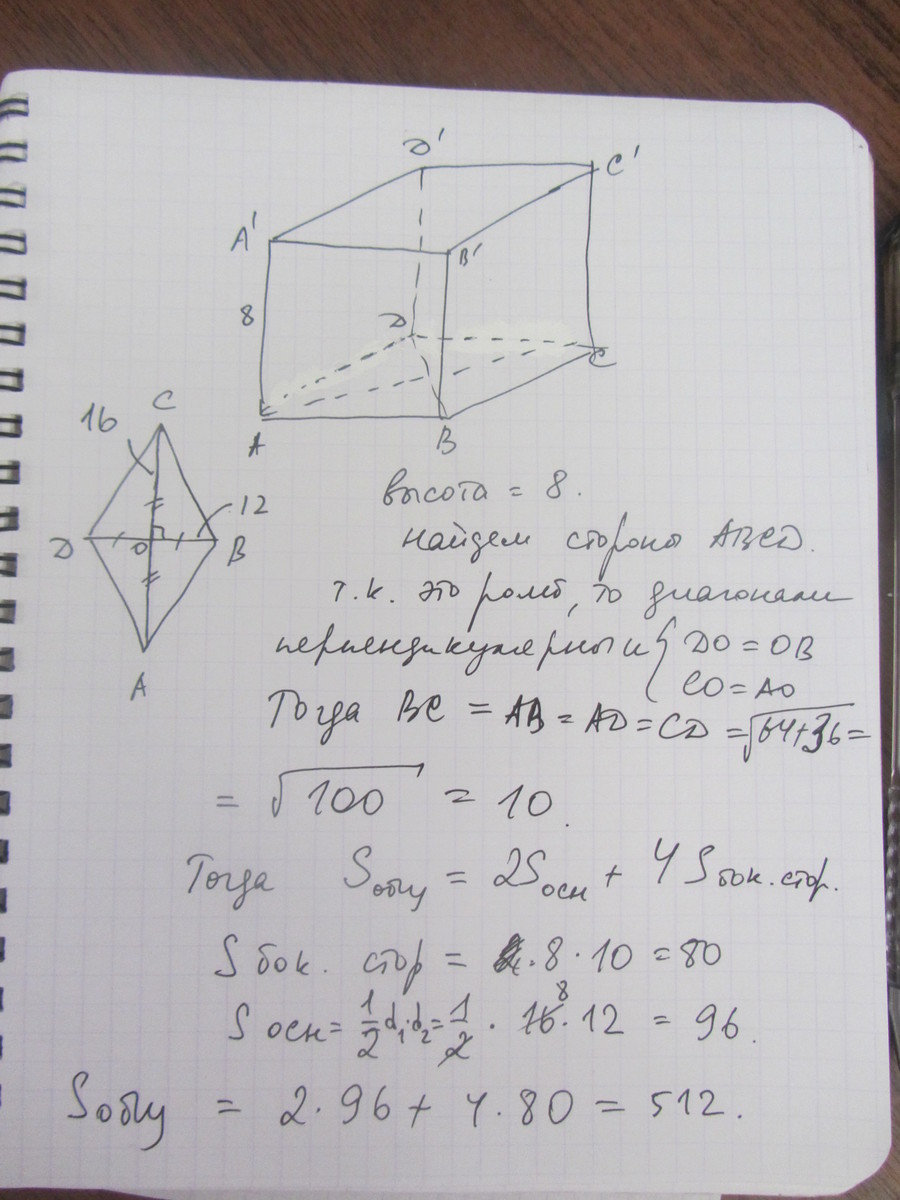 В основании прямого параллепипеда лежит ромб, диагонали которого равны 12см и 16см. Высота параллепипеда-8см.Найдите площадь его полной поверхности.