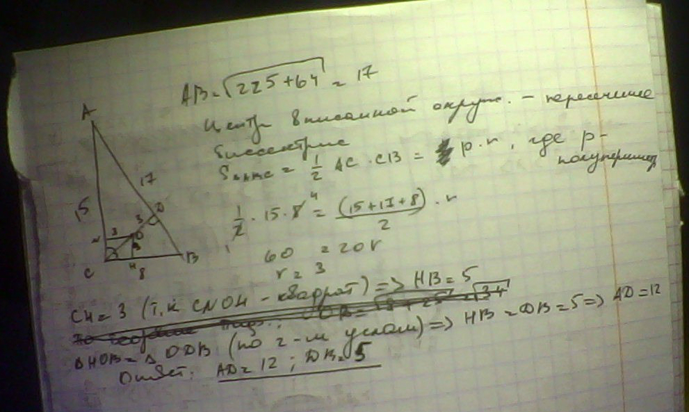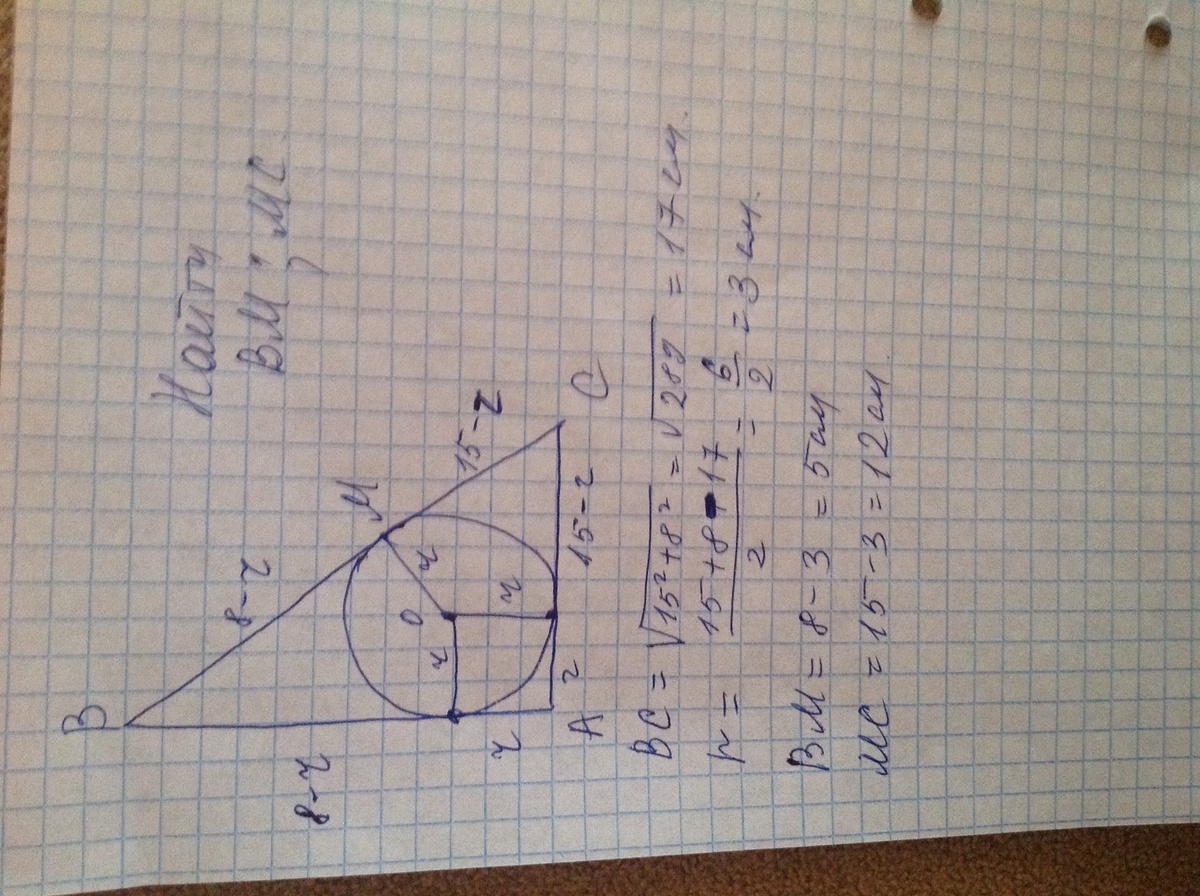 прямоугольный треугольник катеты равны 15 см и 8 см. найдите длины отрезков, на которые вписанная в треугольник окружность делит гипотенузу точкой касания. пожалуйста помогите с рисунком если можно