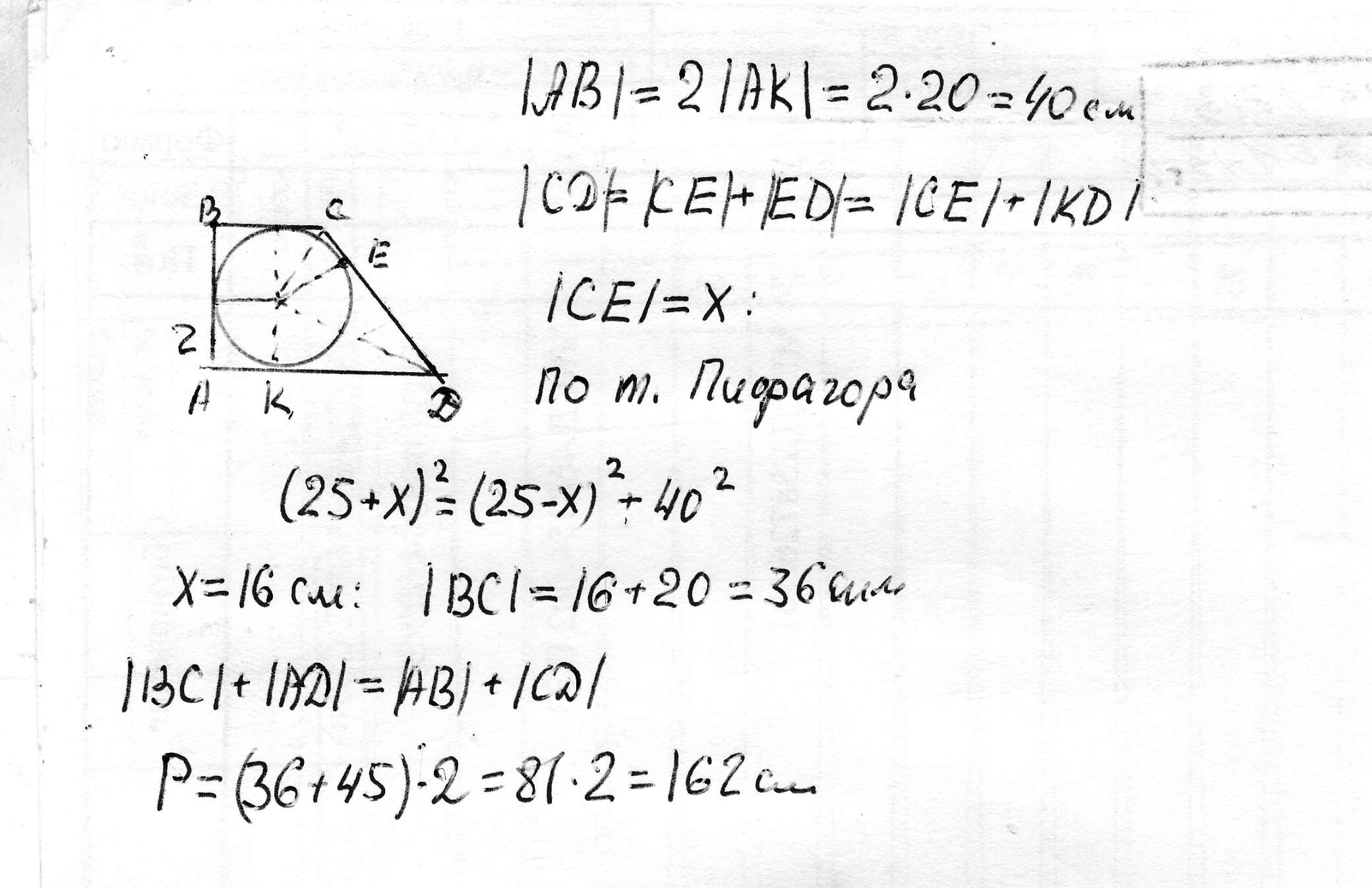 Точка дотику кола ,вписаного в прямокутну трапецію , ділить її більшу основу на відізки 20 см і 25 см периметр . Обчисліть периметр трапеції .