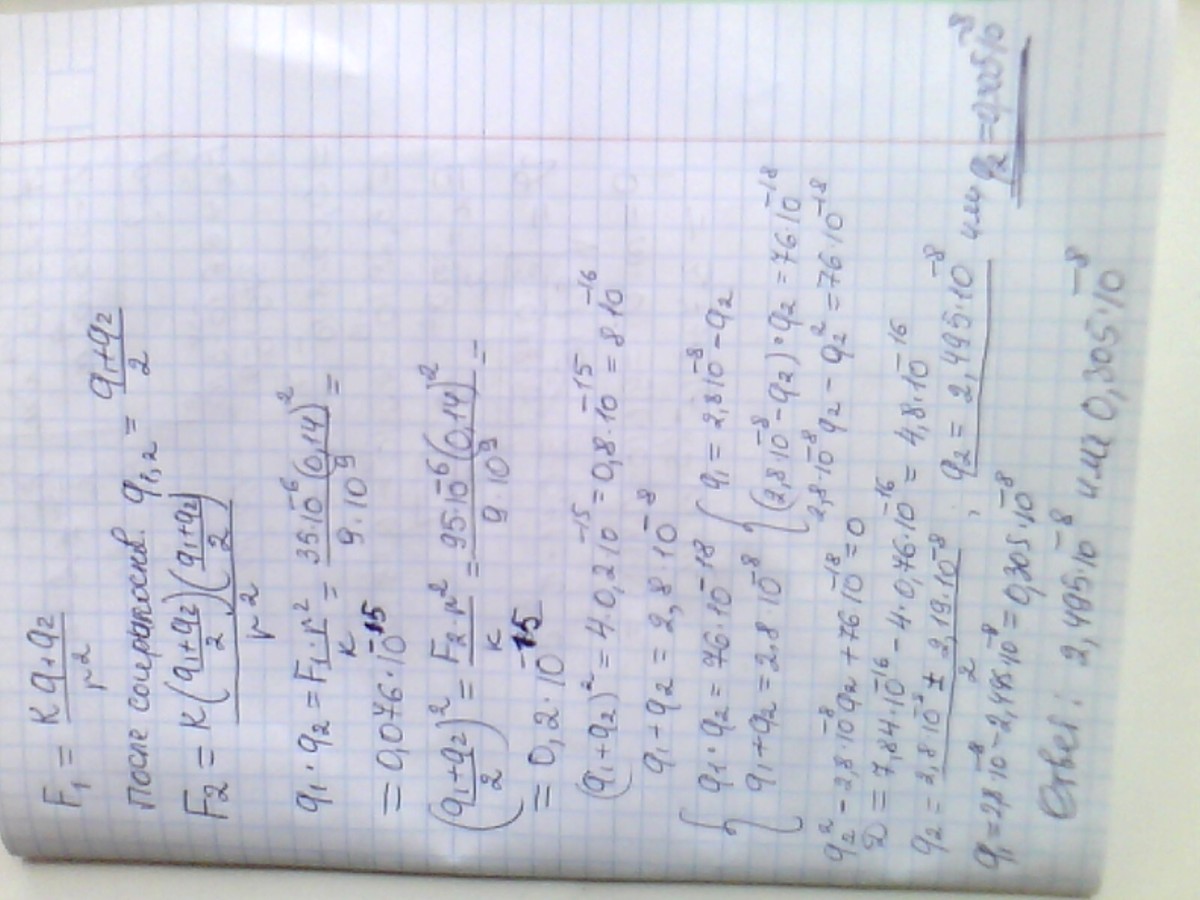Сила притяжения двух одинаковых металических шаров находящихся на расстоянии 14см, равна 35мкН. После того как шары были проведены в соприкосновение и удалены на прежнее расстояние, они стали отталкиваться с силой 95мкН. Определить заряды q1 и q2 шаров до соприкосновения. Диаметр шаров считать много меньшим расстоянии между ними.