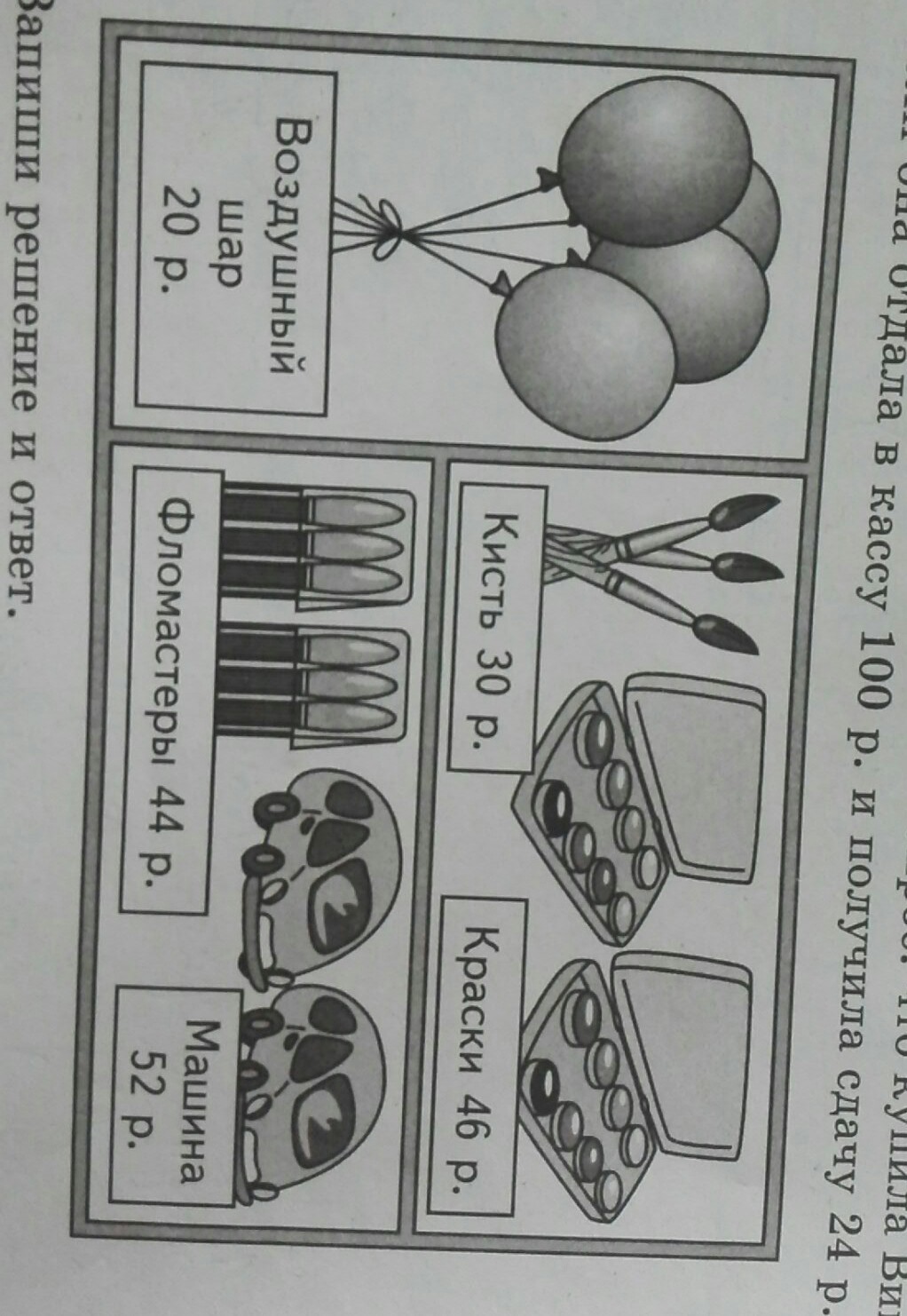 Рассмотри рисунок и ответь на вопрос:что купила Вика в магазине,если она отдала в кассу 100 рублей и получила сдачу 24 рубля?.