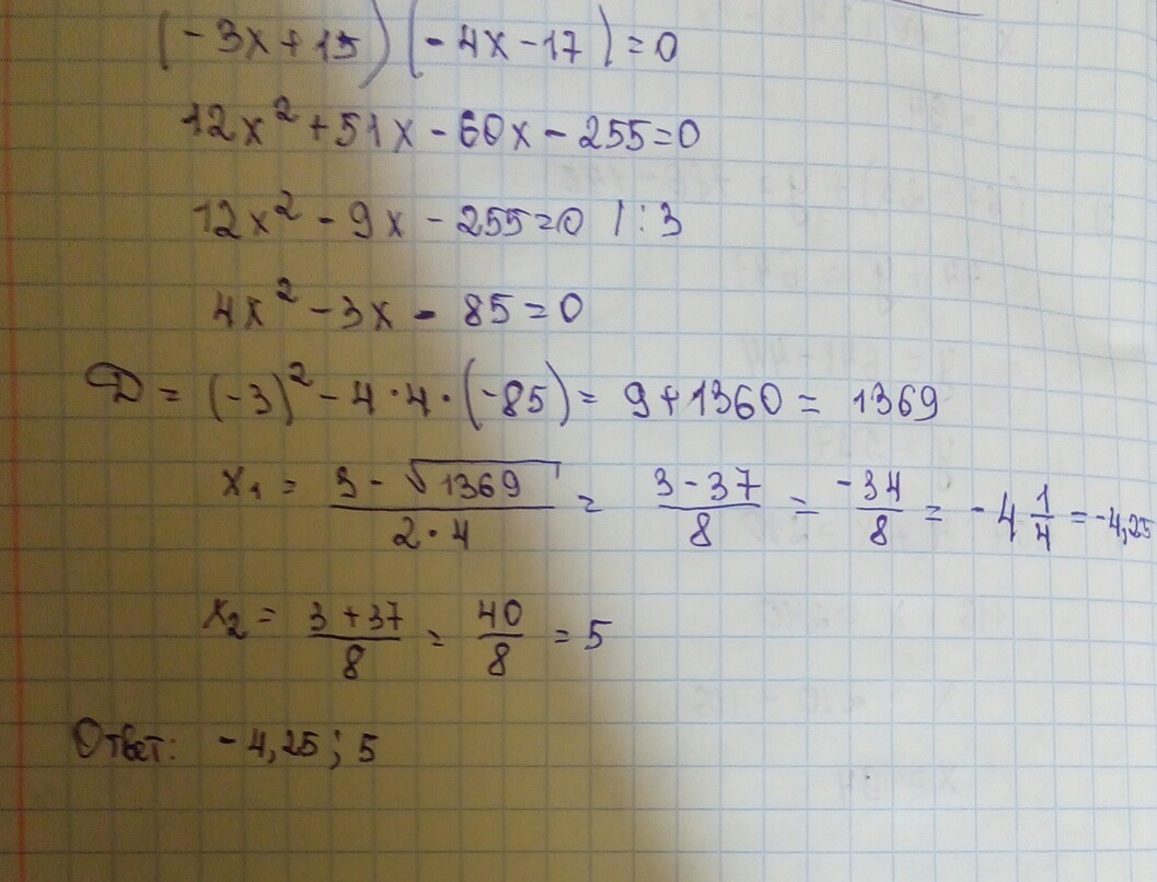 Произведение равно нулю ,в данном случае, когда один из множителей равен нулю. Поэтому -3x+15=0, или 24x-17=0. Отсюда x1=5; x2=17/24