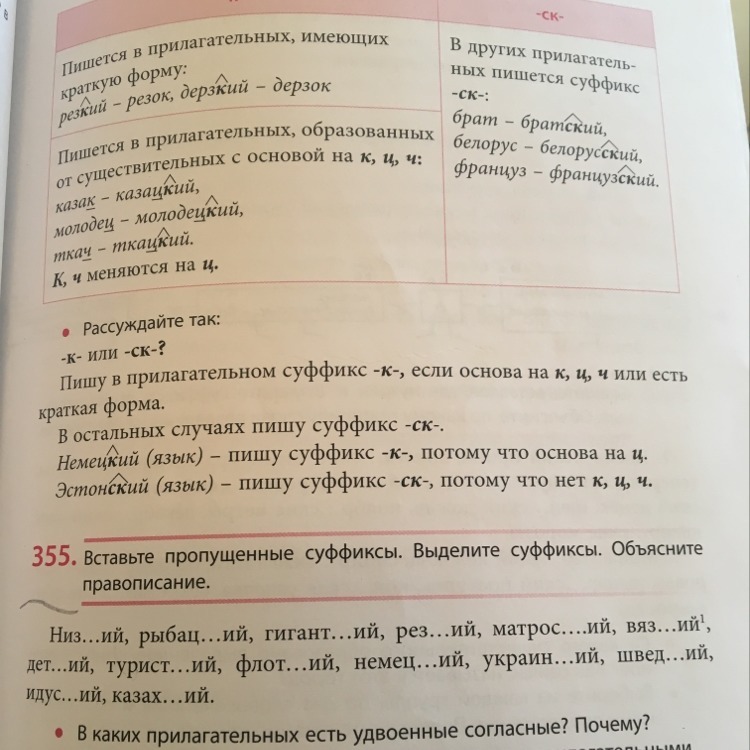 Упражнение 355 СРОЧНО ПРОШУ ВАС ПОМОГИТЕ НАДО СДЕЛАТЬ:ПОСЛЕ ПРИЛАГАТЕЛЬНОГО СТАВИТЬ ДЕФИС И ПИШЕМ СУЩЕСТВИТЕЛЬНОЕ,ОТ КОТОРОГО ОНО ОБРОЗОВАЛОСЬ.ВЕДЕЛЯЕМ СУФФИКС В ПРИЛАГАТЕЛЬНЫХ.Не делать дополнительное задание