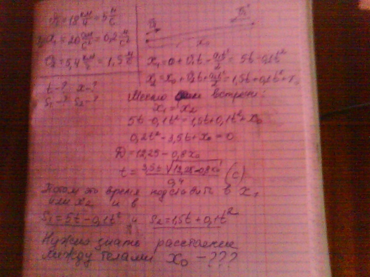 Задача на равноускоренное движение. Два велосипедиста едут навстречу друг другу. Один из них с начальной скоростью 18 км/ч поднимается в гору равнозамедленно с постоянным ускорением, модуль которого 20 см/с2. Другой велосипедист с начальной скоростью 5,4 км/ч спускается с горы с таким же по модулю ускорением. Через какое время они встретятся? На каком расстоянии от подножия горы произойдет встреча и какой путь пройдет каждый из них к этому моменту?