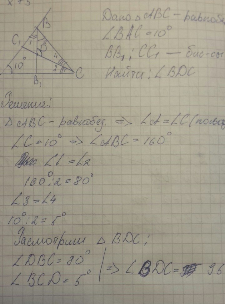 В треугольнике ABC угол A=10 градусов . Биссектрисы CC u BB пересекаются в точке D . Найти угол BDC