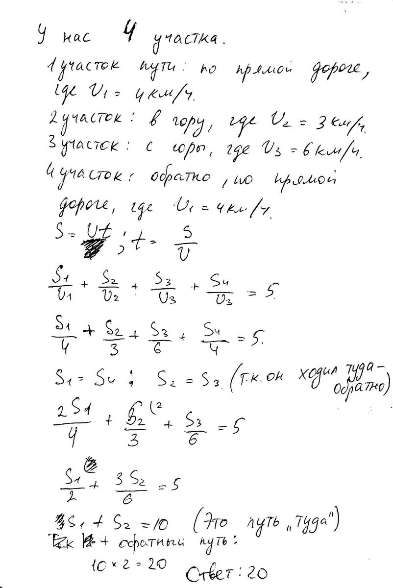 здесь записано сколько времени он шел в по ровному участку (x-2y)/4 и сколько в гору и с горы (другие два слагаемых)
