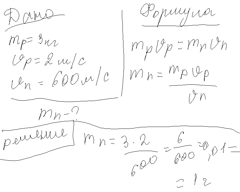 mп = mр*vр / vп = 3кг*2 м/с / 600 м/с = 0,001 кг = 1 г