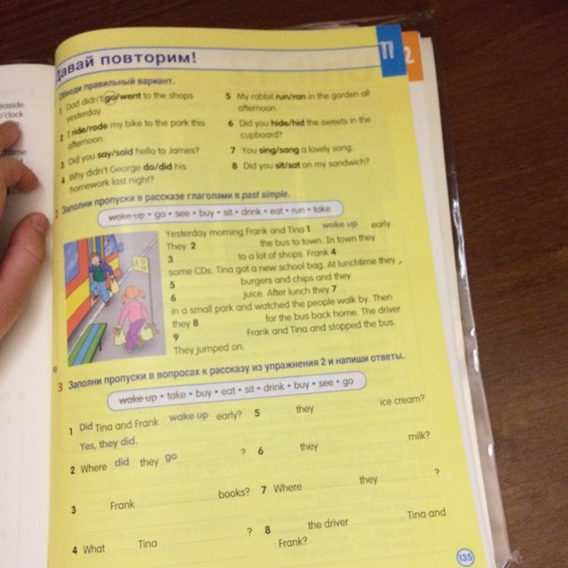 Второе: woke up, took, went, bought, ate, drank, ran, took, saw