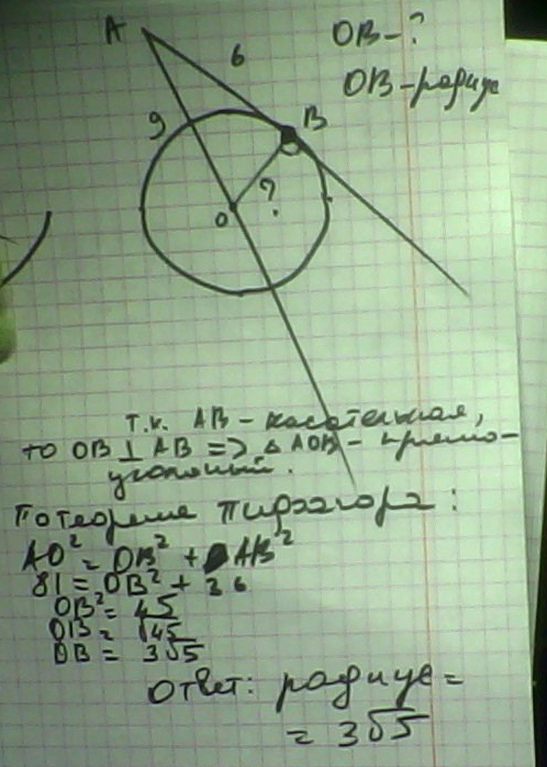 к окружности с центром в точке О проведена касательная АВ и секущая АО.Найдите радиус окружности,если АВ=6,АQ=9