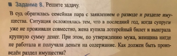 Ну так как жена выиграла лот билет, когда они ещё не были в разводе, следовательно и этот выигрышь должен разделится по ровну.