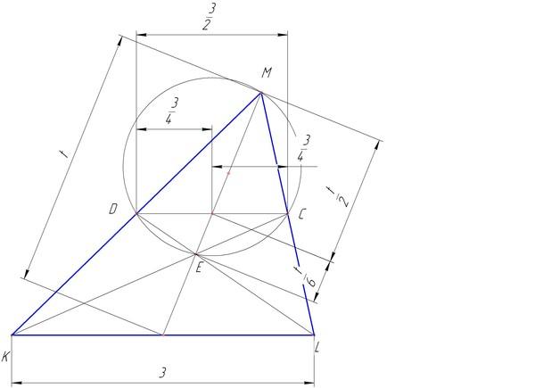 Медианы KC и LD треуголника KLM пересекаются в точке E. Найдите длину отрезка EM, если KL=3 и известно, что вокруг четырехуголника ECMD можно описать окружность.