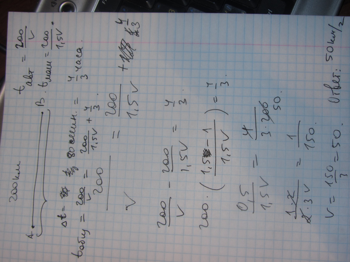 из города А в город В, находящийся на расстоянии 200 км от города А, выехал автобус. Через 1 ч 20 мин вслед за ним выехал автомобиль,скорость которого в 1,5 раза больше скорости автобуса.Найдите скорость автобуса,если в город В они прибыли одновременно с автомобилем.