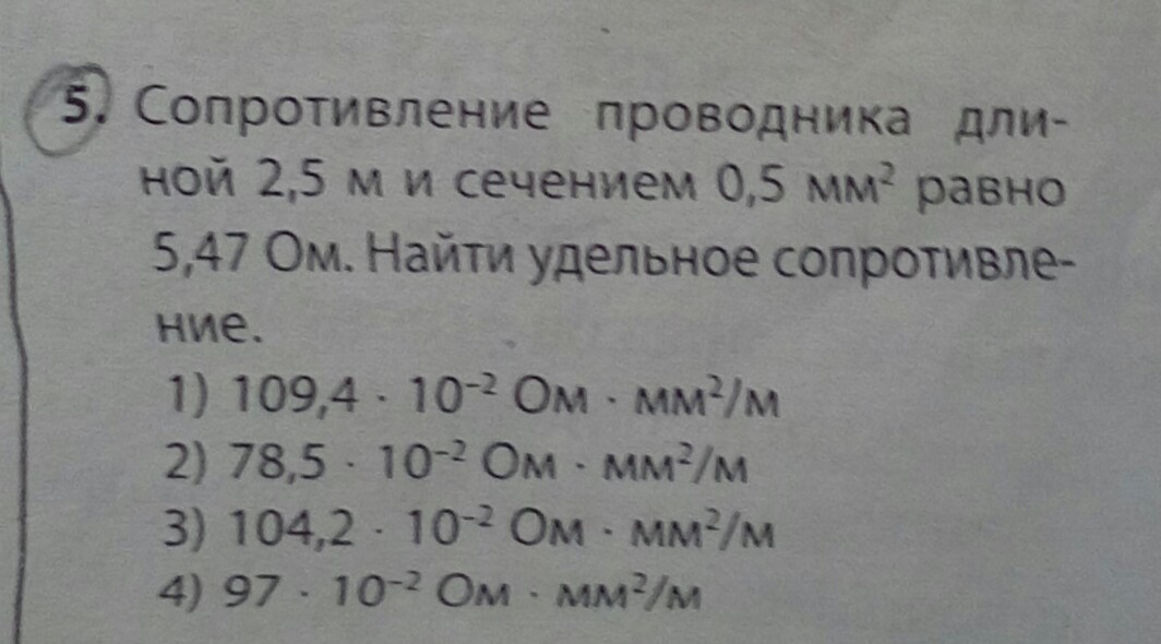 R=pl/S; p=RS/l; p=5.47*0.5/2.5=1.094 Ом*мм^2/м