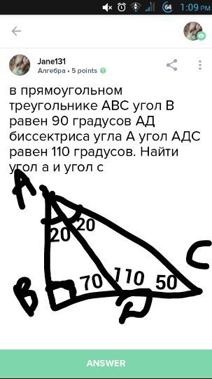 в прямоугольном треугольнике АВС угол В равен 90 градусов АД биссектриса угла А угол АДС равен 110 градусов. Найти угол а и угол с