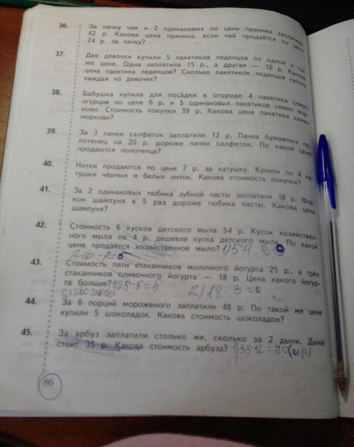 41 задача: 2 одинаковых тюбика з.п. 18:2=9(1 тюбик зуб.пасты)