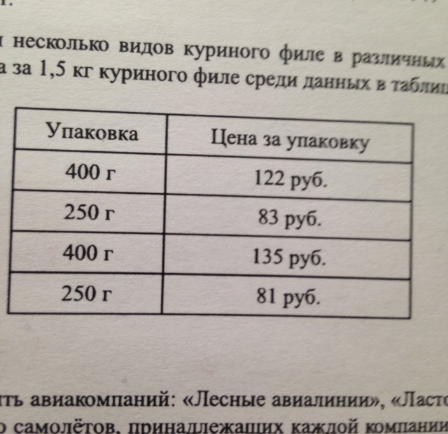 Магазине продаются несколько видов куриного филе в различных упаковках по разной цене какова наименьшее цена за 1,5 кг куриного филе среди данных в таблицы видов