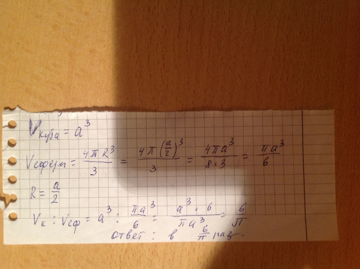 Vкуба / Vсферы = a^3 / (pia^3/6) = 6/pi