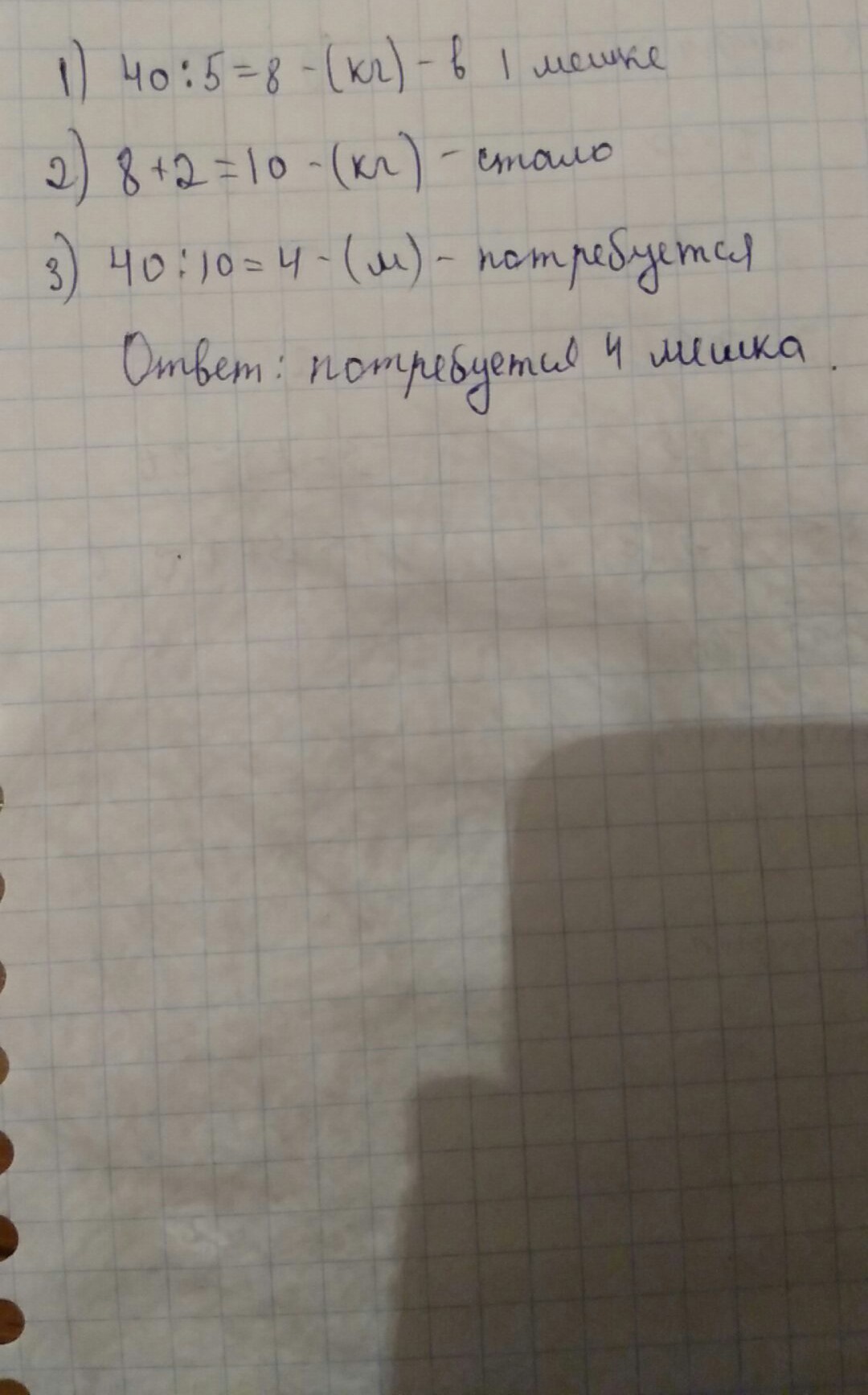 5 мешков расшифровали 40 кг муки Сколько потребуется мешков если в каждой будет входить на 2 кг муки больше