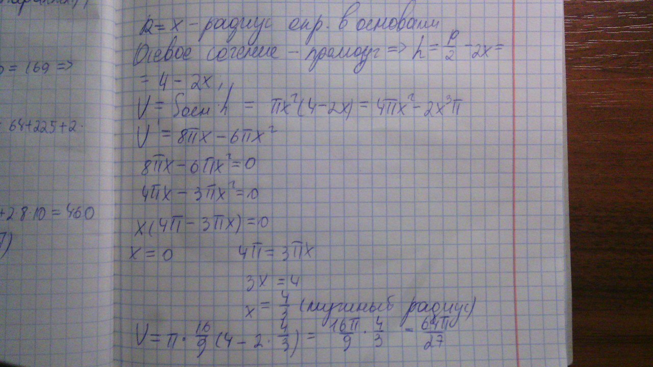 из всех цилиндров у которых периметр первого сечения равен 8,выбран цилиндр наибольшего объёма,найти этот объем)