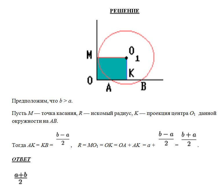 На одной стороне прямого угла с вершиной О взяты точки А и В так, что АО=а, ОВ=b. Найдите радиус окружности, касающейся второй стороны угла и проходящей через точки А и В.