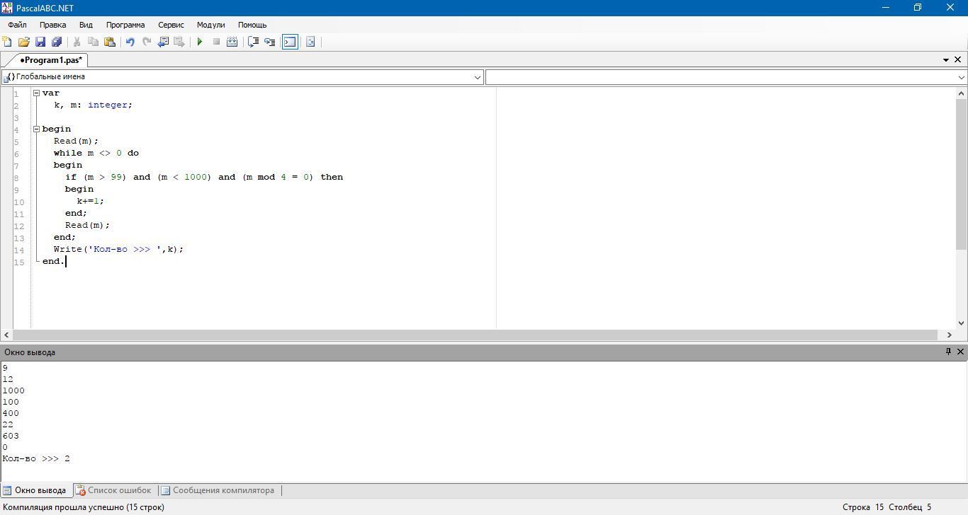 Помогите, пожалуйста!!! Напишите программу, которая в последовательности натуральных чисел определяет количество трёхзначных чисел, кратных 4. Программа получает на вход натуральные числа, количество введённых чисел неизвестно, последовательность чисел заканчивается 0 (0 - признак окончания ввода, не входит в последовательность).