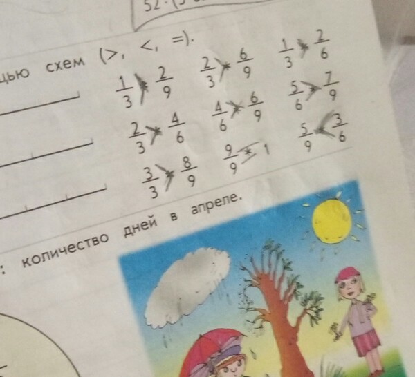 а) 1/3 и 2/9,б) 2/3 и 6/9, ; в) 1/3 и 2/6, ; г) 2/3 и 4/6, д) 4/6 и 6/9, е) 5/6 и 7/9, ё) 3/3 > 8/9;