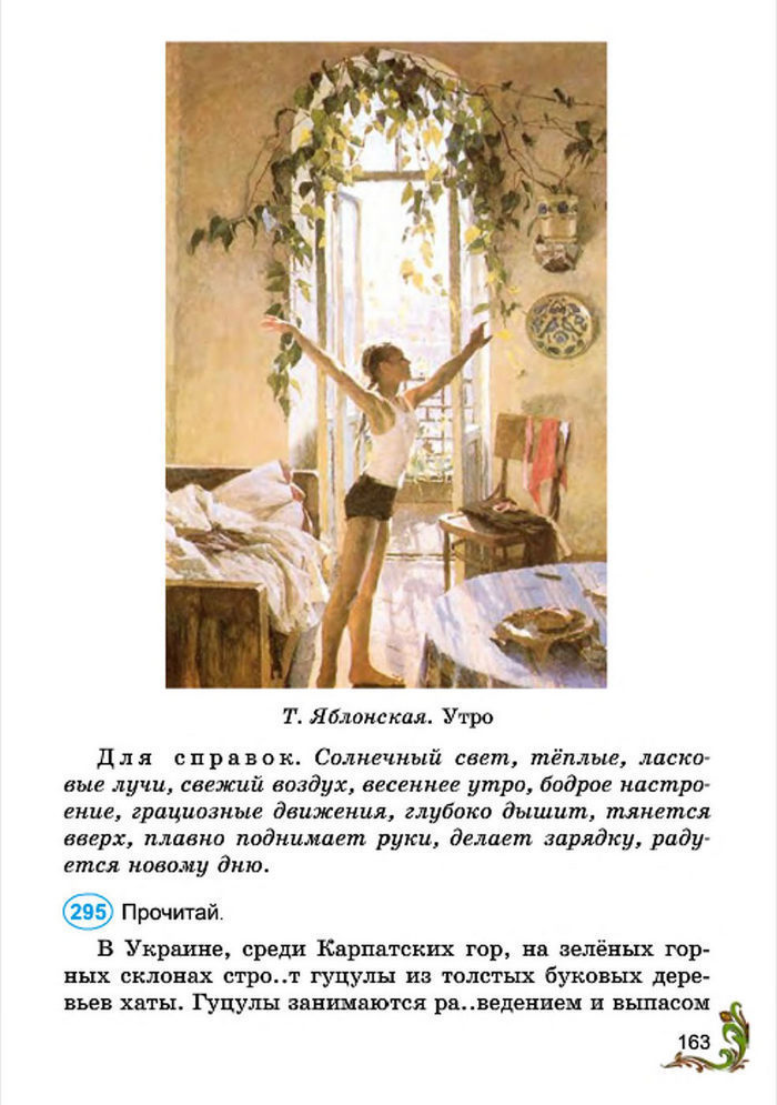 Описание темы: Утро. Девочка, недавно проснувшись, делает зарядку. Легкая и непринужденная обстановка, как бы самого естества природы простого солнечного утра в обыкновенном доме. Художественное описание картины Яблонской "Утро" .