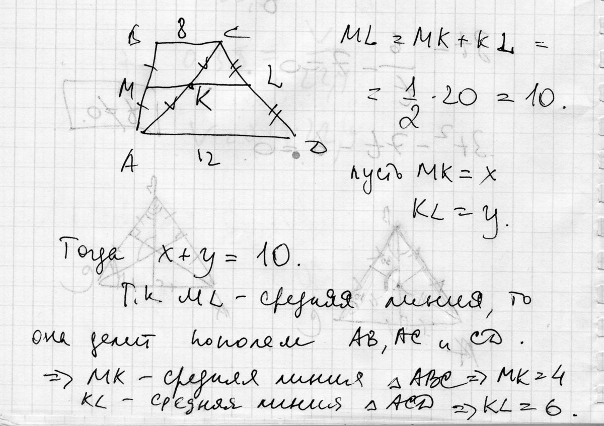 в трапеции abcd с основаниями ad=12 см и bc=8 см проведена средняя линия ml, которая пересекает диагональ ac в точке k. чему равны отрезки mk и kl
