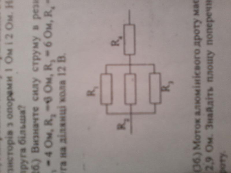 Определите силу тока в резисторе R4, если R1 = 4 Ом, R2 = 3 Ом, R3 = 6 Ом R4 = 2 Ом Ом, а напряжение на участке цепи 12 В