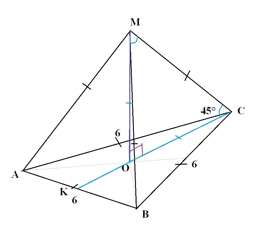 Высота МО⊥(АВС), тогда МО⊥CO. ∆МОС - прямоугольный и ∠МСО=45°, значит и ∠СМО=45°. Значит, ∆МОС - равнобедренный, тогда СО=МО =2√3.