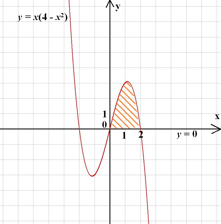 На координатной плоскости ХОУ постройте область, ограниченную заданными линиями, и найдите ее площадь. y=x(4-x^2) и y=0 (0 <или= Х <или=)