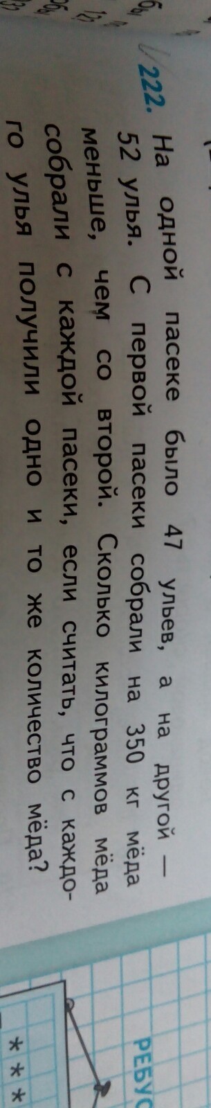на одной пасеке было 47 ульев а на другой 52 улья с первой пасеки собрали на 350 кг меньше чем со второй Сколько килограммов меда собрали с каждой пасеки если считать что с каждого улья получили одного и того же количества меда.Помогите пж
