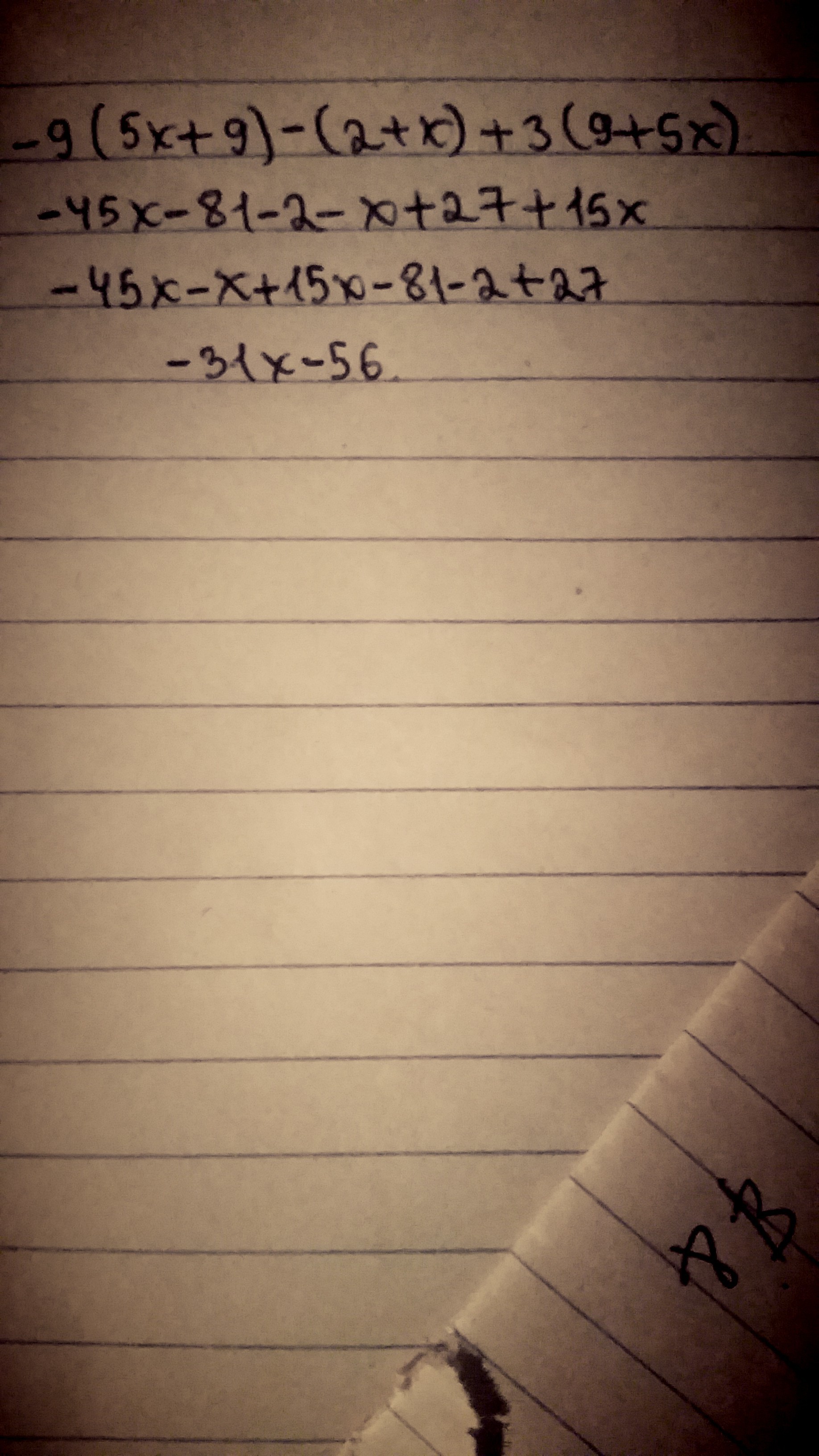 Запиши выражение без скобок и упрости его: −9(5x+9)−(2+x)+3(9+5x) Ответ: выражение без скобок (пиши без промежутков, не меняя порядка слагаемых)