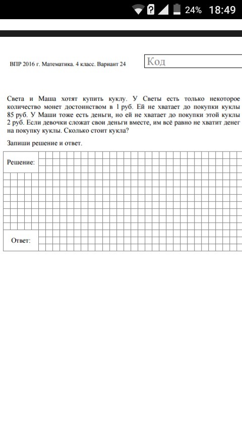 монета. Но Свете не хватает до покупки 85 руб. Значит, кукла стоит 86