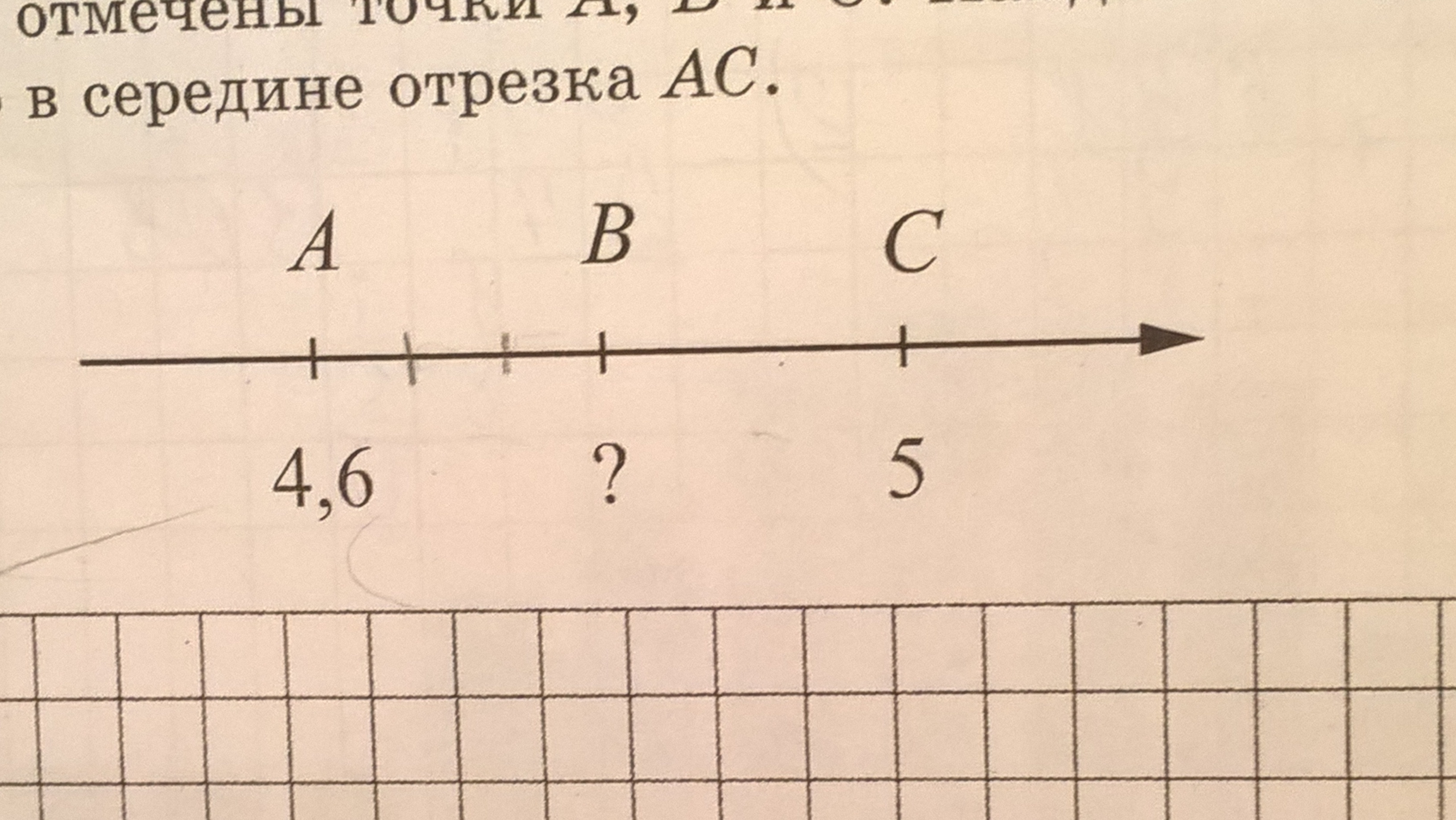 На координатном луче отмечены точки A,B и С. Найдите координату точки В,если она расположена точно в середине отрезка АС.