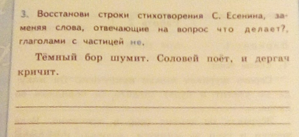 Просто пиши точно так же как в тексте,но только перед глаголом ставь частицу не .Например "Не шумит,не поёт"