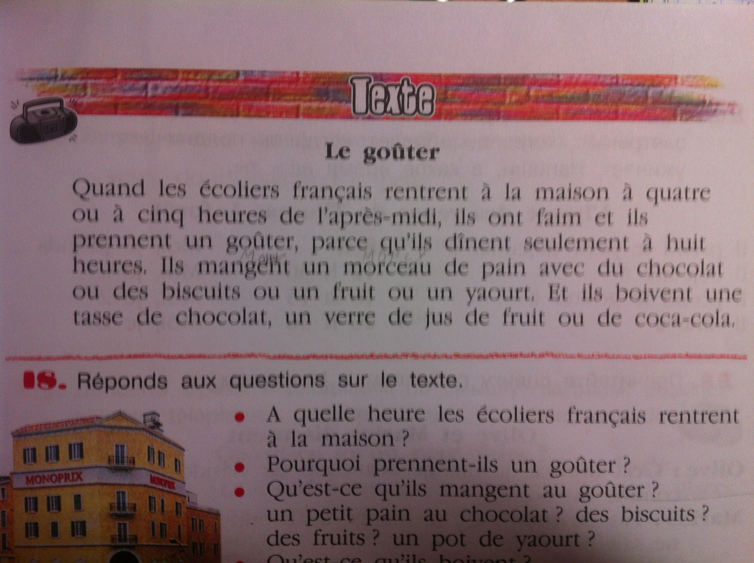 Когда французские школьники возвращаются домой в 4 или 5 часов после обеда, они голодны и полдничают, потому что ужинают они только в 8 часов. Они едят кусок хлеба с шоколадом или бисквит или фрукт или йогурт. Они пьют чашку шоколада, стакан фруктового сока или кока-колы.