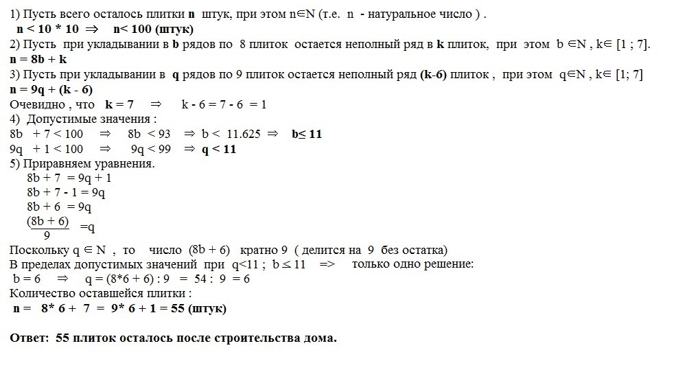 После строительства дома осталось некоторое количество плиток. Их можно использовать для выкладывания прямоугольной площадки на участке рядом с домом. Если укладывать в ряд по10 плиток, то для квадратной площадки плиток не хватает. При укладывании по8 плиток в ряд остается один неполный ряд, а при укладывании по9 – тоже остается неполный ряд, в котором на 6 плиток меньше, чем в неполном ряду при укладывании по8. Сколько всего плиток осталось после строительства дома?
