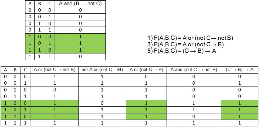 Выражение F(A,B,C) называется ЛОГИЧЕСКИМ СЛЕДСТВИЕМ из выражения G(A,B,C), если выполняется следующее условие: на тех наборах переменных (A,B,C), где выражение G принимает истинное значение, выражение F также принимает истинное значение. Дано логическое выражение: G(A,B,C)= А and (В → not С). Какие из перечисленных выражений являются логическим следствием из него?