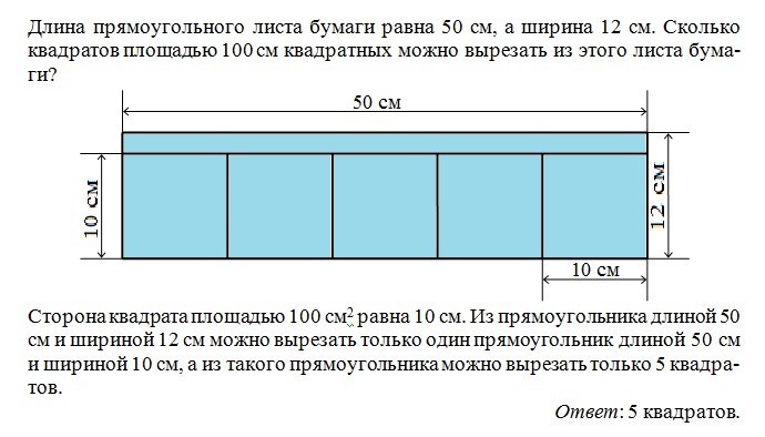 Длина прямоугольного листа бумаги равна 50 см,а ширина 12 см. Сколько квадратов площадью 100 см квадратных можно вырезать из этого листа бумаги?