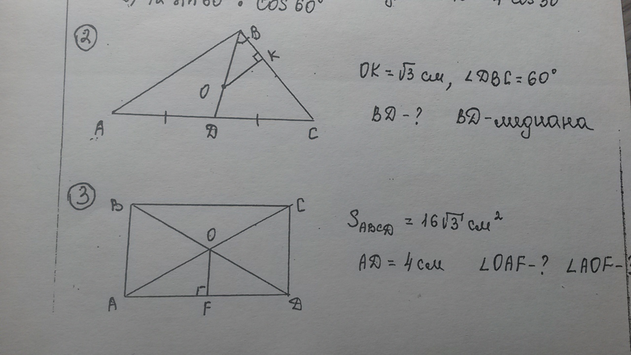 2. Из треугольника ВОК можно найти ВО. ОК=ВО*Sin <OBK. ВО=корень из3 : корень из 3/2=2. А дальше честно не знаю?