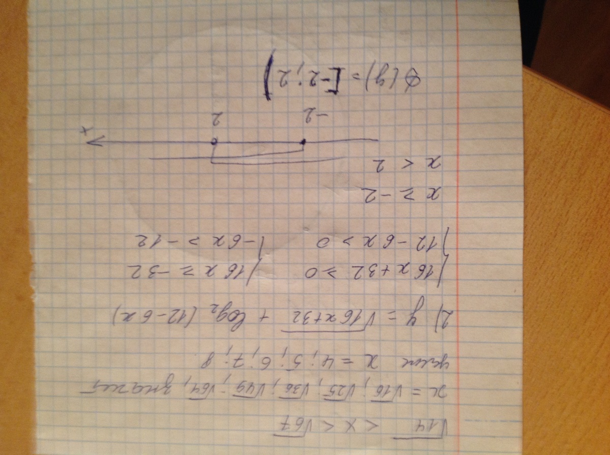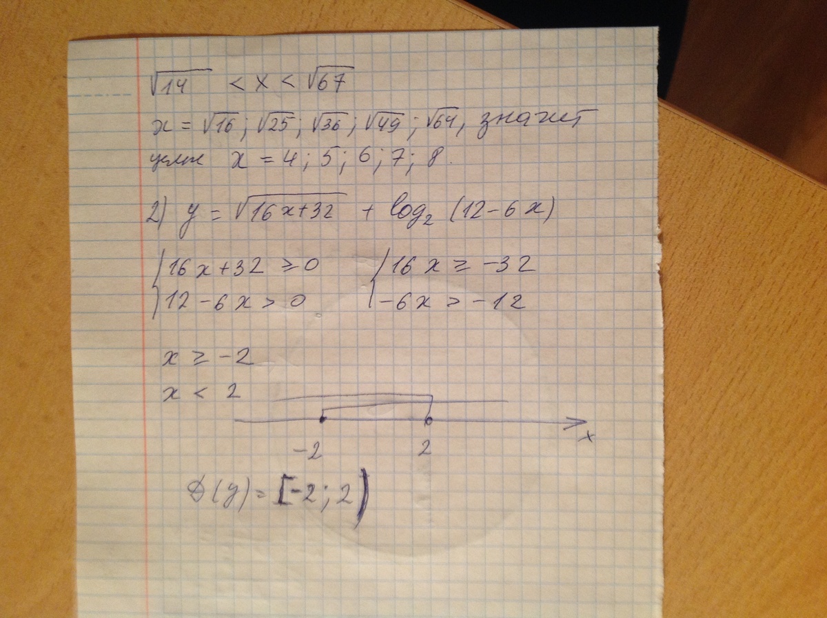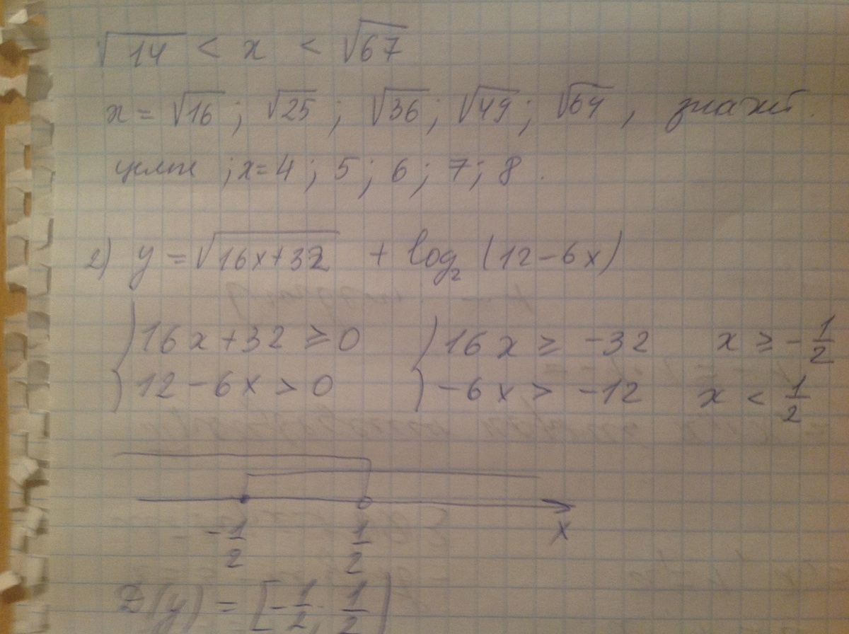 1)найти все целые решения неравенства√14<х<√67 2)найти область определения функции у=У=√16х+32+log_2(12-6х)
