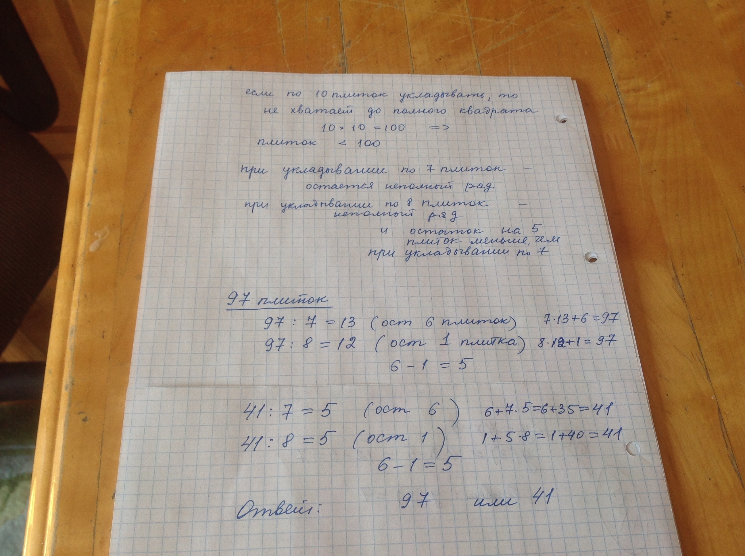 После строительства дома осталось некоторое количество плиток.Их можно использовать для выкладывания прямоугольной площадки на участке рядом с домом.Если укладывать по 10 плиток,то для квадратной площадки плиток не хватает.При укладывании по 7 плиток в ряд остаётся один неполный ряд,а при укладывании по 8-тоже остаётся неполный ряд,в котором на 5 плиток меньше,чем в неполном ряду при укладывании по 7.Сколько всего плиток осталось после строительства?