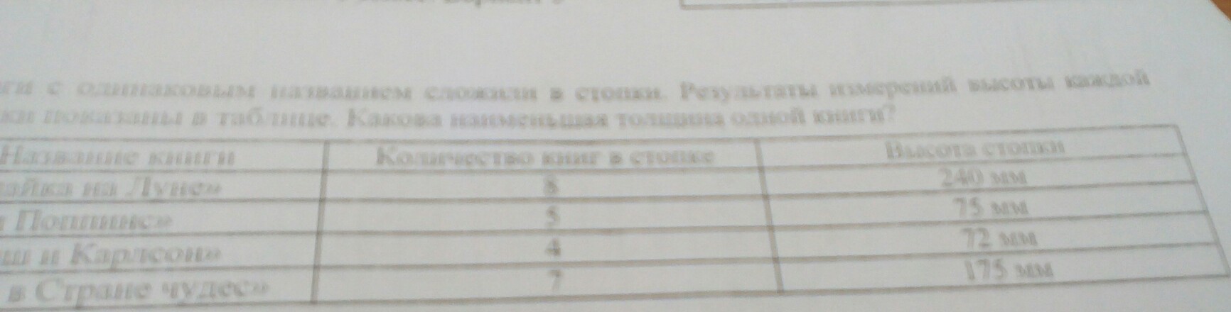 книги с одинаковым названием сложили в стопки . Результаты измерений высоты каждой стопки показаны на таблице . Какая наименьшая толщина одной книги?