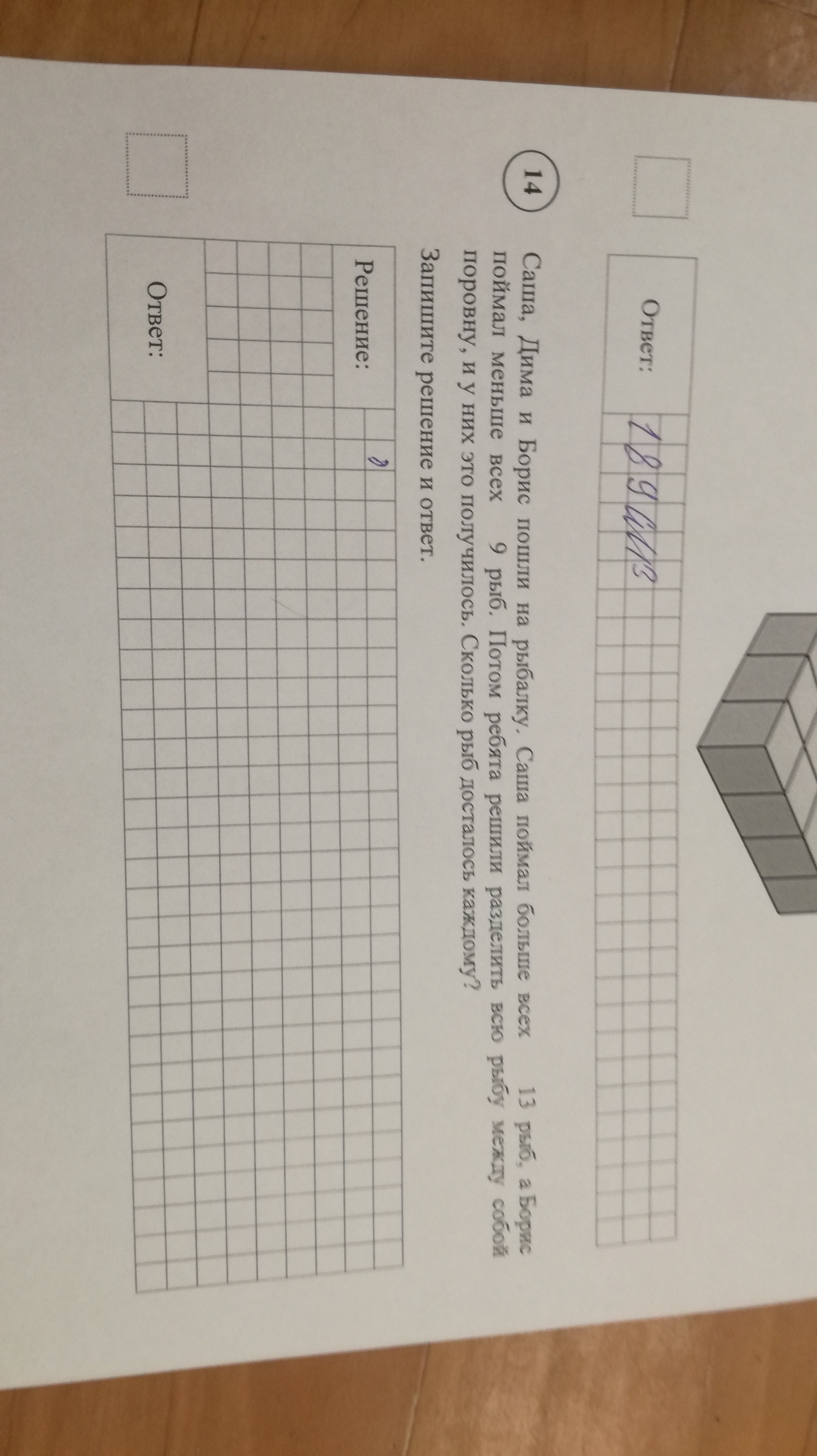 Дима поймал 11 рыб потому ,что Саша поймал больше всех-13рыб,а Борис меньше всех-9. Дима мог поймать 10 или 11 либо 12 рыб.Если взять 10 то получится вместе 32 рыбы и нельзя будет разделить на три,а если 12 то будет вместе 34 рыбы это число тоже нельзя разделить на 3.