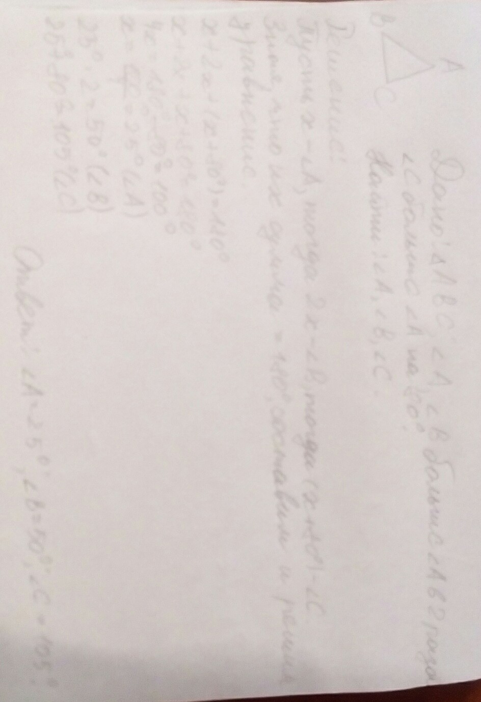 Найдите углы треугольника, если один из них меньше второго в два раза и меньше третего на 80 градусов (P.S. если можно то желательно пожаговое решение , чтобы понятнее)