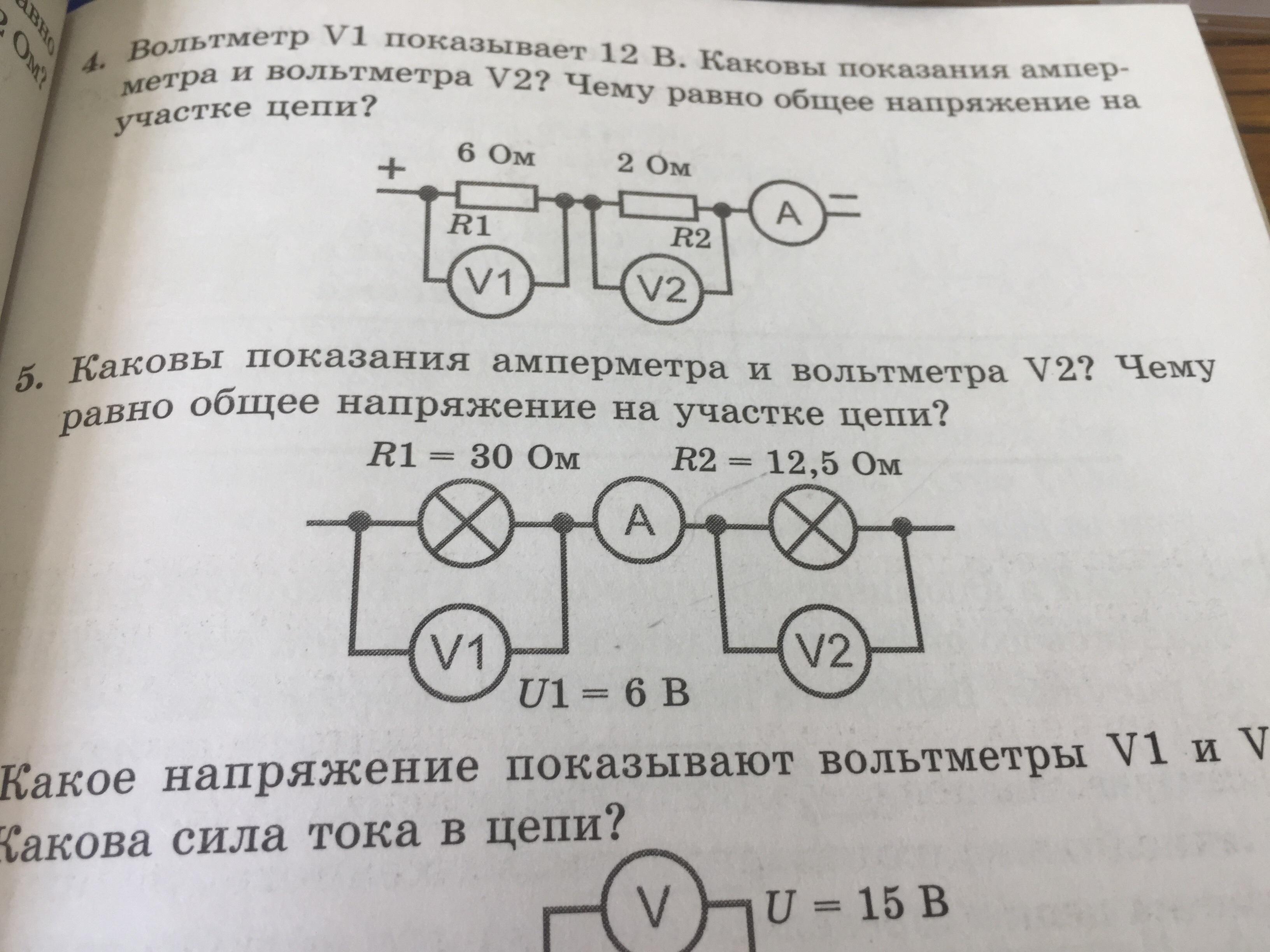 каковы показания амперметра и вольтметра V2? Чему равно общее показание напряжение на участке цепи (5)