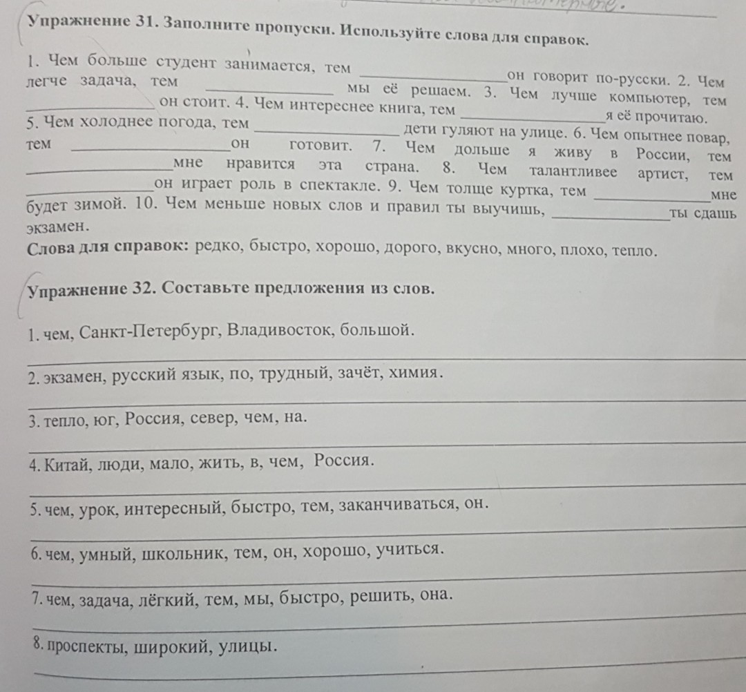 упр. 31. 1) Чем больше студент занимается, тем БЫСТРЕЕ (ЛУЧШЕ тоже подойдет) он говорит по-русски. 2) Чем легче задача, тем БЫСТРЕЕ мы ее решаем. 3) Чем лучше компьютер, тем ДОРОЖЕ он стоит. 4) Чем интереснее книга, тем БЫСТРЕЕ я ее прочитаю. 5) Чем холоднее погода, тем РЕЖЕ дети гуляют на улице. 6) Чем опытнее повар, тем ВКУСНЕЕ он готовит. 7) Чем дольше я живу в России, тем БОЛЬШЕ (от "много") мне нравится эта страна. 8) Чем талантливее артист, тем ЛУЧШЕ (от "хорошо") он играет роль в спектакле. 9) Чем толще куртка, тем ТЕПЛЕЕ мне будет зимой. 10) Чем меньше новых слов и правил ты выучишь, тем ХУЖЕ (от "плохо") ты сдашь экзамен.