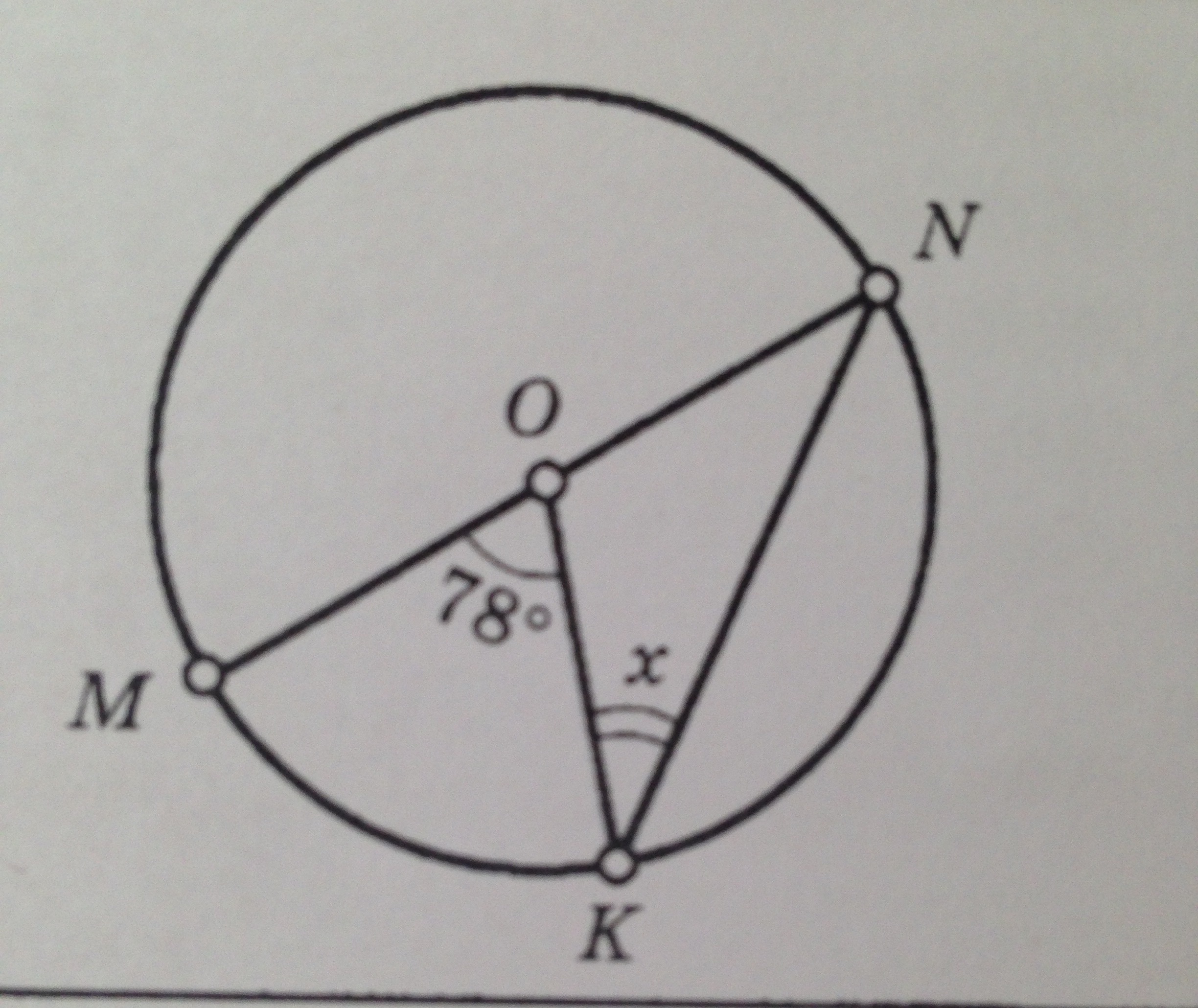 Угол MNK вписанный, равен половине соответствующего центрального угла MO, т.е. Угол MNK =1/2*угол МОK=78/2=39 Из треугольника NOK равнобедренного (у него стороны равны как радиусы) х=угол ONK=39 градусов